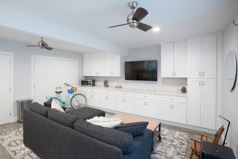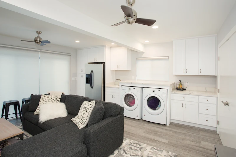 An inviting, rustic farmhouse remodel of this Long Beach residence's kitchen and Den living area.